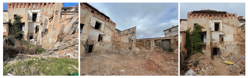 El ayuntamiento de Montón, con una pequeña subvención, consiguió en 2024 terminar la ejecución de nuestro proyecto de consolidación. Entre otras cosas, sacó los escombros del solar, que impedían el acceso a la fachada y cerró los huecos que quedaban abiertos con nuevas vigas y tableros provisionales para poder así acceder con comodidad a toda la casa.
