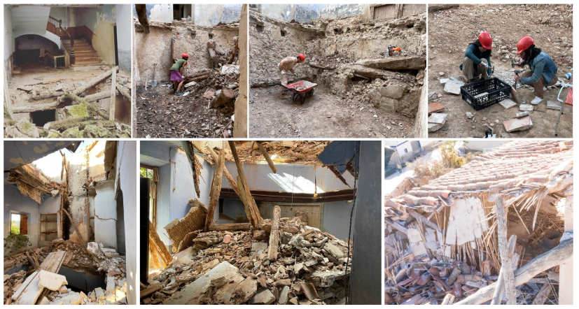 • Desescombramos manualmente las partes interiores colapsadas, separando los materiales (yesos, cerámicas, madera y cañas) para así recuperar algunos elementos para la posterior rehabilitación.
