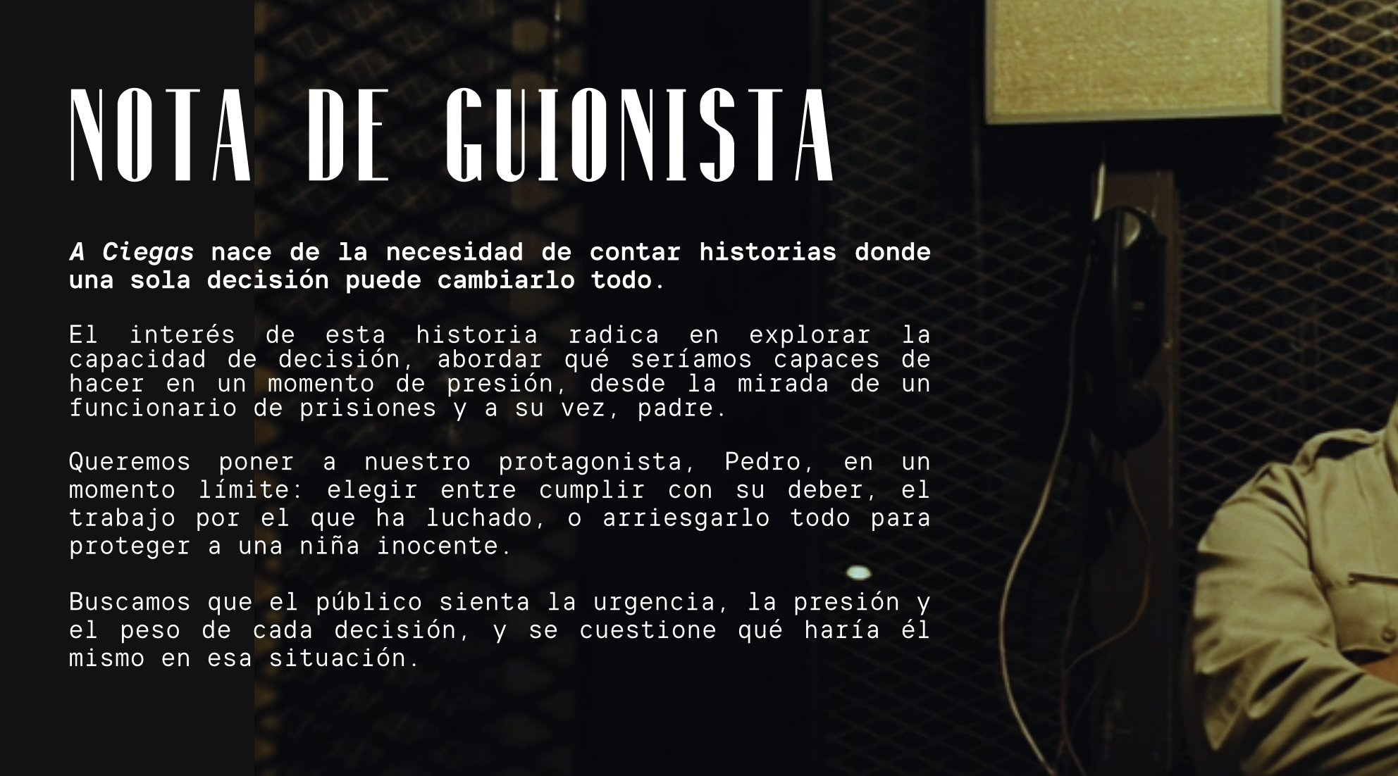 Desde el inicio, este cortometraje se concibió como la historia de un personaje encerrado y asfixiado. La acción transcurre en un único espacio, siempre junto a Pedro, sin elipsis ni personajes secundarios que lo salven: solo él, sus cuatro paredes y un teléfono como única herramienta. El objetivo es que el espectador experimente la misma angustia, soledad y tensión que vive el protagonista. La atmósfera sonora reforzará esas emociones soledad, aislamiento y asfixia que son el eje central de la propuesta.