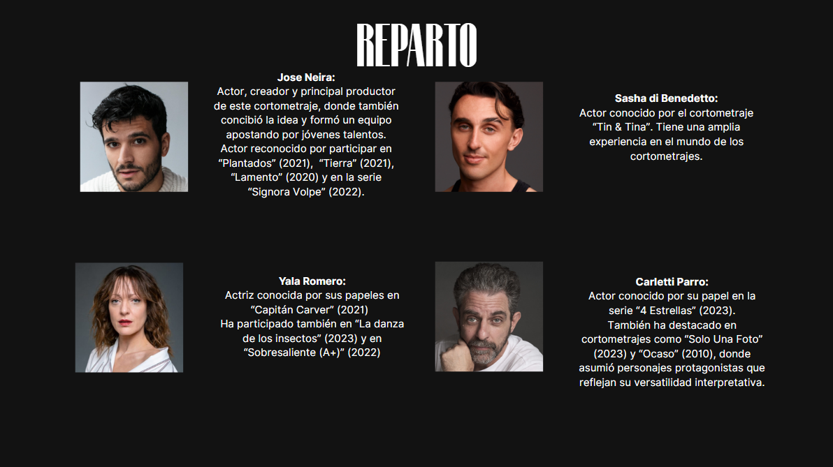 Somos un equipo multidisciplinar de jóvenes apasionados por el cine que, tras finalizar nuestra formación, nos hemos unido para dar vida a nuestras propias historias. Este cortometraje nace de la ilusión compartida por crear y demostrar que las nuevas generaciones también podemos sacar adelante proyectos sólidos y con identidad.