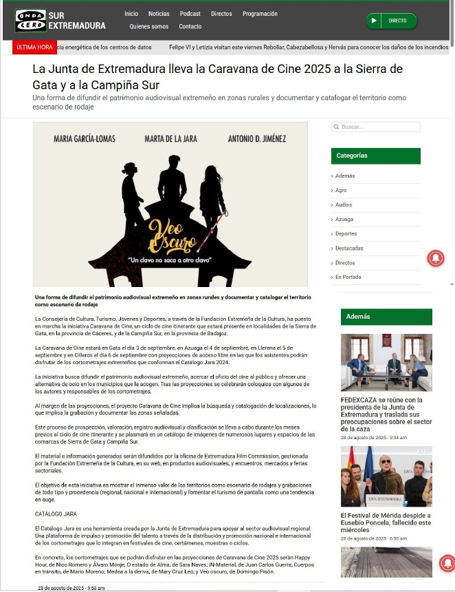 Tras el éxito del cine rural durante el fin de verano en Extremadura y La Rioja, el ya pasado primer fin de semana de Septiembre, "Veo Oscuro" regresó a Extremadura con nuevas proyeccciones de cine rural bajo el nombre de "Caravana de Cine" en diversas localidades de las provincias de Cáceres y Badajoz.