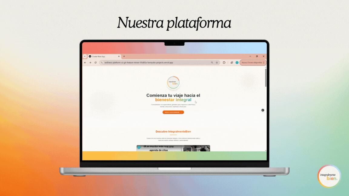IntegralmenteBien es una plataforma digital de bienestar que guía a mujeres en su camino hacia una vida más plena, conectándolas con especialistas y recursos personalizados para reconectar, equilibrar y transformar su salud integral.
