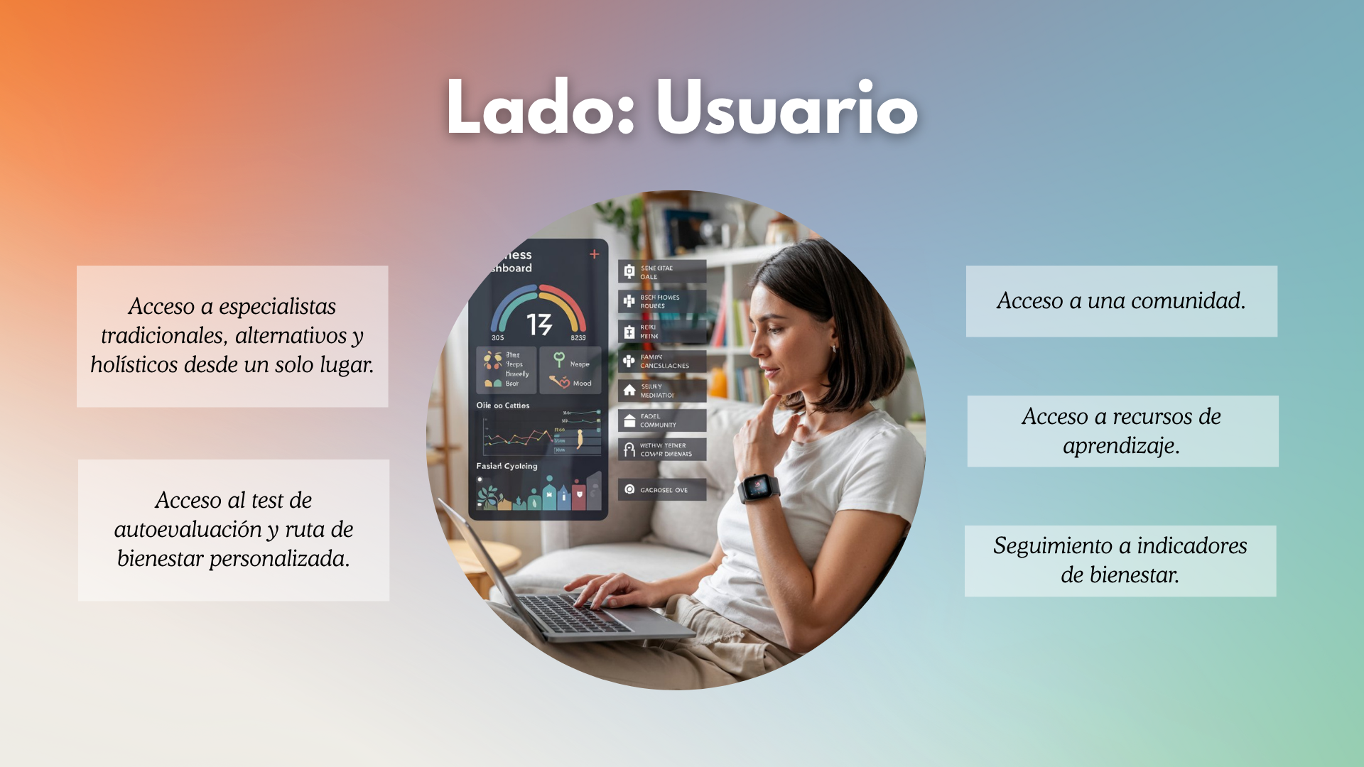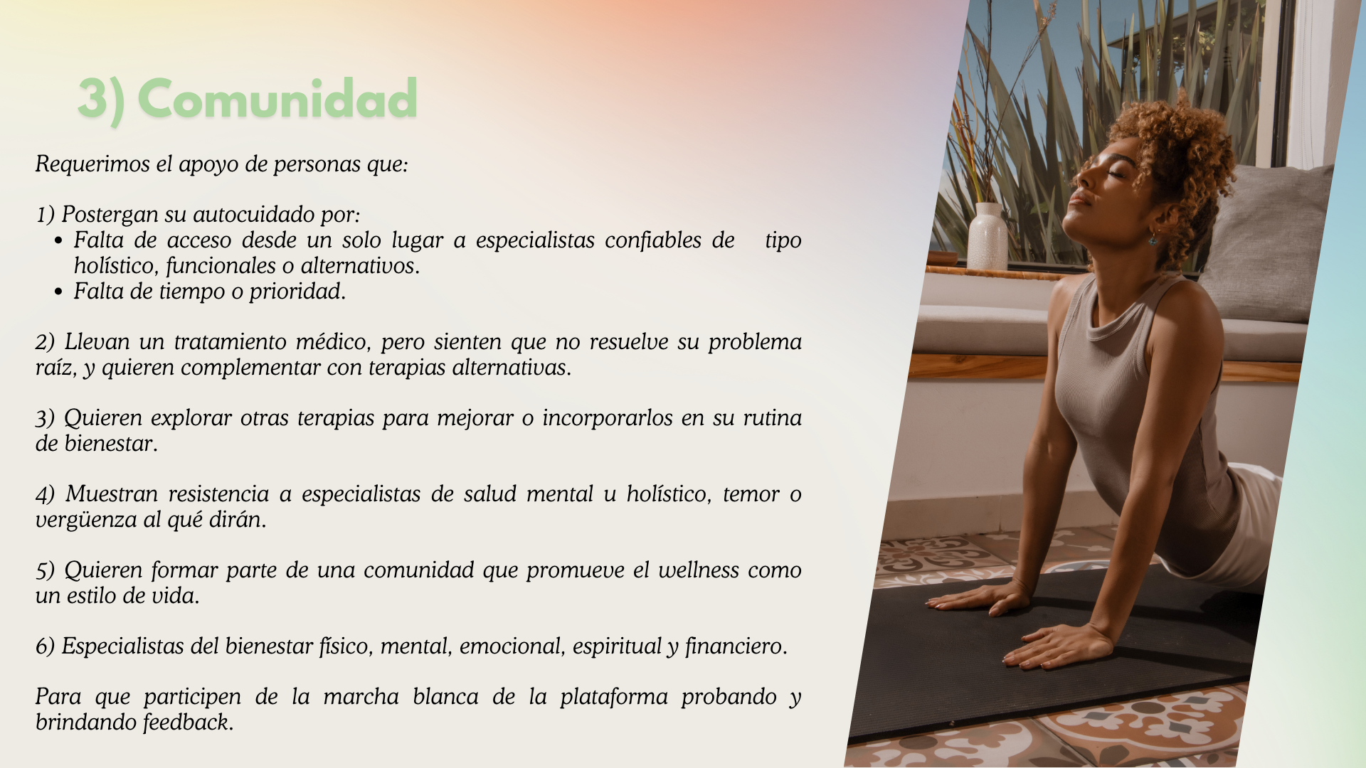 Me encuentro muy alineada con el propósito del proyecto, existen soluciones infinitas de bienestar pero no lo enfocan de forma holística como Uds. Que se haga realidad IntegralmenteBien!