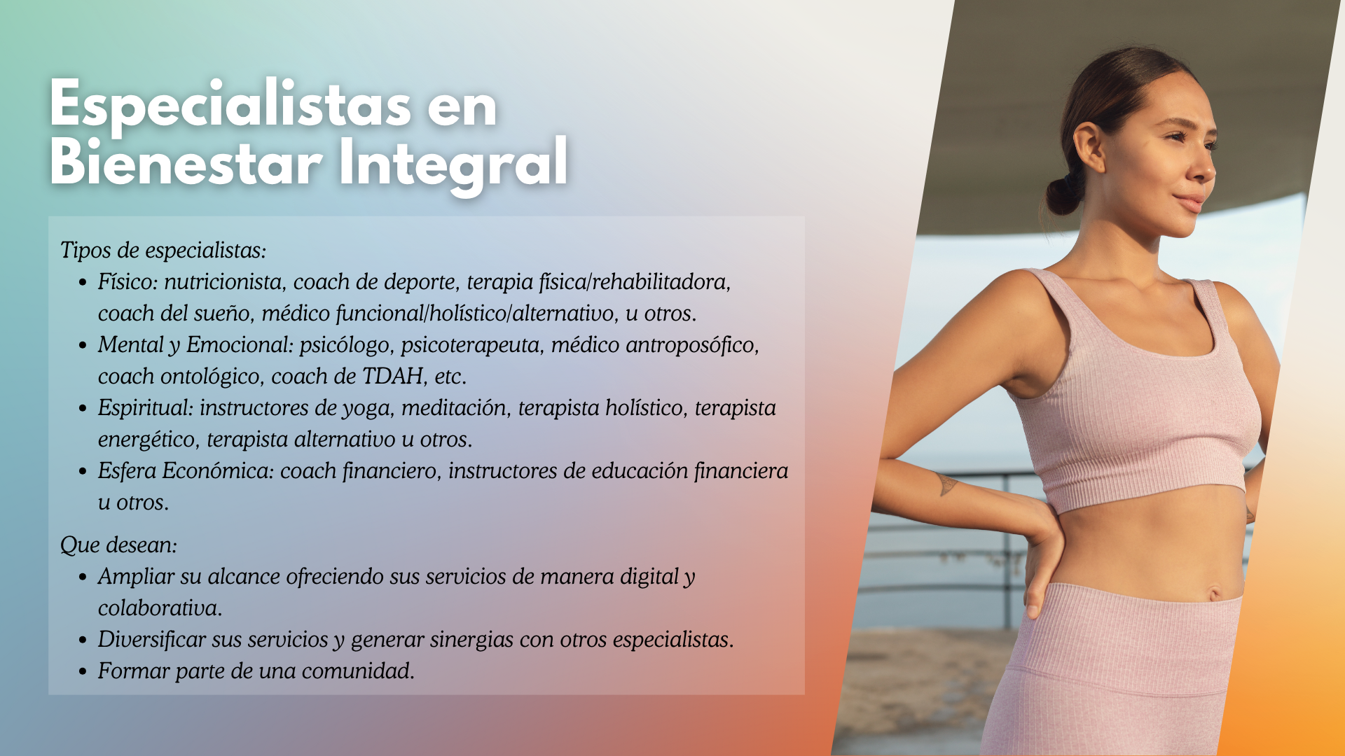 IntegralmenteBien (IB) es una plataforma digital BTC que conecta a mujeres entre 25 y 55 años, cuidadoras y profesionales, con especialistas del Bienestar físico, mental, emocional, espiritual y financiero.