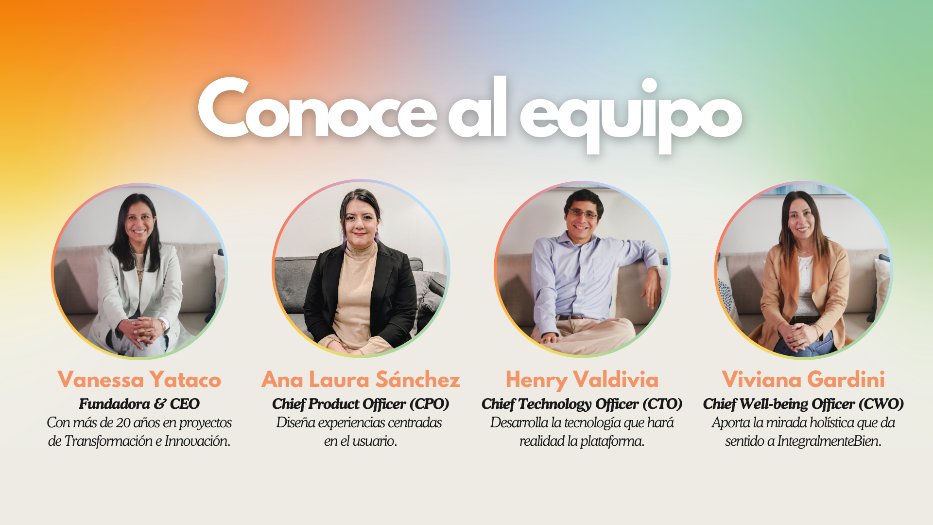 Somos un equipo multicultural, comprometido con transformar el bienestar en la vida de más personas. Desde Perú y México, combinamos experiencia en tecnología, bienestar y desarrollo de productos digitales. Vanessa lidera como CEO con más de 20 años de experiencia en proyectos de Transformación e Innovación; Henry, nuestro CTO, desarrolla la tecnología que hará realidad la plataforma; Ana Laura, como CPO, diseña experiencias centradas en el usuario; y Viviana, nuestra Chief Wellbeing Officer, aporta la mirada holística que da sentido a IntegralmenteBien.