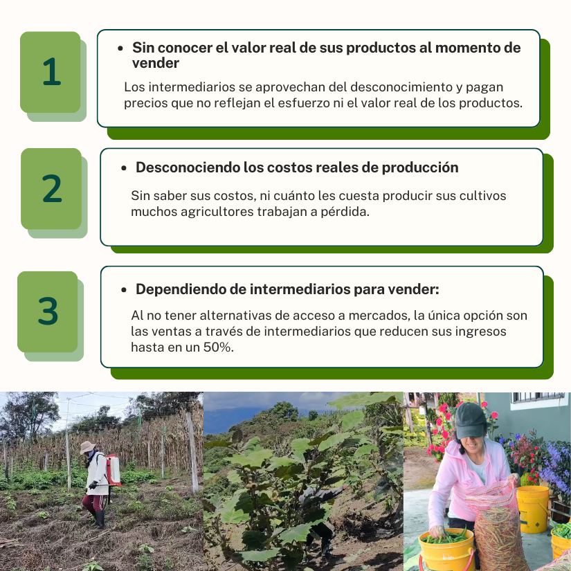 A nivel global, más del 70% de los alimentos provienen de pequeños agricultores, pero estos solo reciben una fracción del valor final. En Colombia, más del 60% de los productores agrícolas son pequeños y medianos, y la mayoría viven en condiciones de pobreza extrema. Además, el 42% de los productos se pierden debido a la falta de infraestructura adecuada. Esto genera enormes pérdidas económicas para los productores, quienes no cuentan con acceso a mercados justos ni a herramientas financieras que les permitan planificar eficientemente.