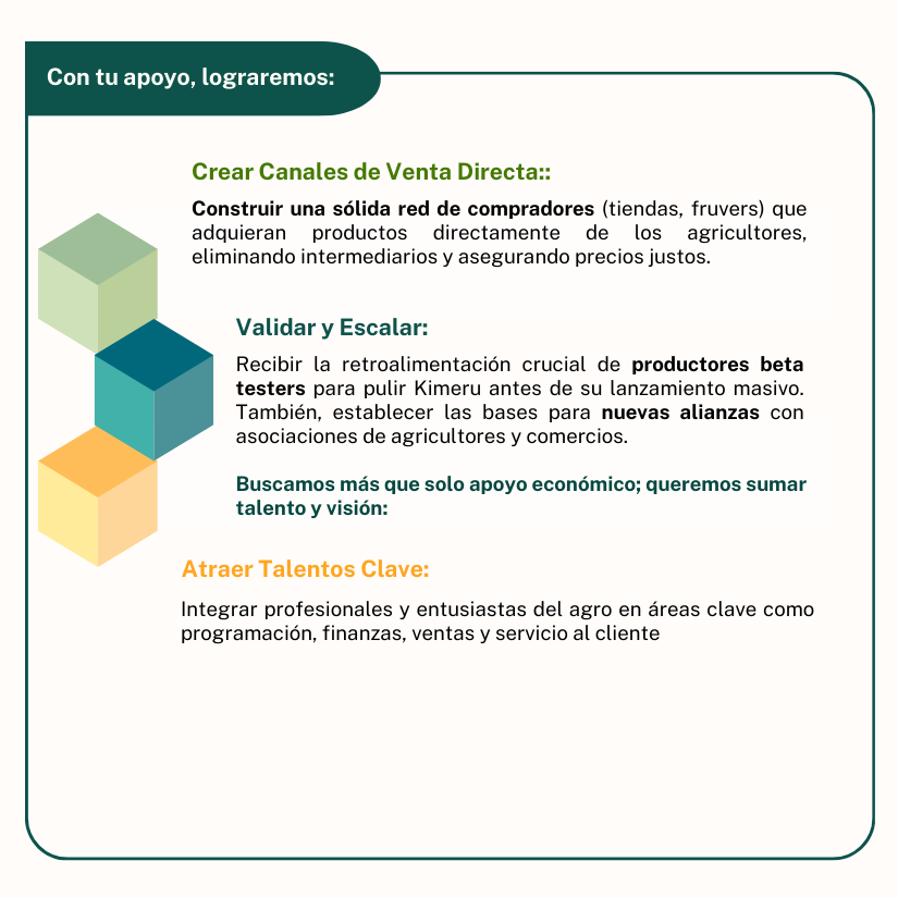 Necesitamos personas que nos ayuden a difundir el mensaje y comenzar a construir una comunidad alrededor de KIMERU para que este movimiento llegue a más agricultores.