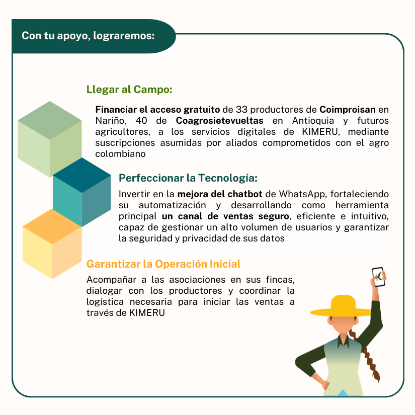 ¡Únete a KIMERU y cambia vidas! Tu apoyo hará que más familias rurales prosperen. Dona, comparte, colabora: cada paso cuenta. Juntos, podemos sembrar un futuro mejor para el campo colombiano. ¡Apoya a KIMERU hoy!