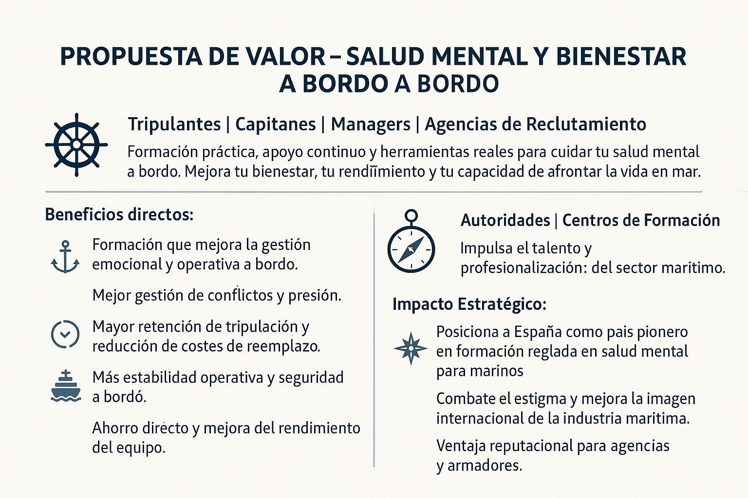 - Psicólogos y psiquiatras con enfoque en salud laboral o marítima, terapeutas, coaches especialistas en bienestar físico y mental.